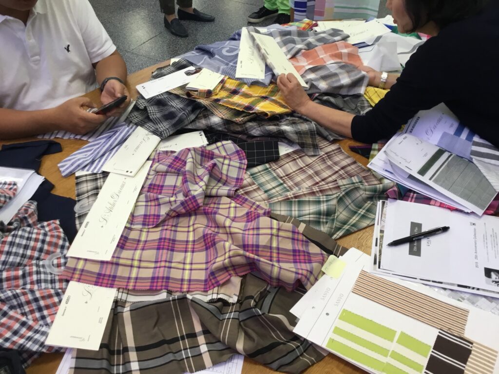 チェックの柄はチェック専門のテキスタイルデザイナーとイメージを相談しながら、CGで柄の配置や配色を組み合わせて作っていきます。